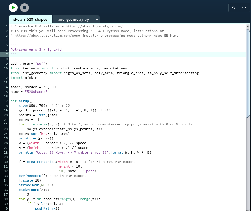These are all the 528 non-self-intersecting polygonal shapes that can be made from a 3 by 3 grid of points, ordered by area. Get a a PDF poster, made with Processing Python mode, and the code you can study and run yourself!